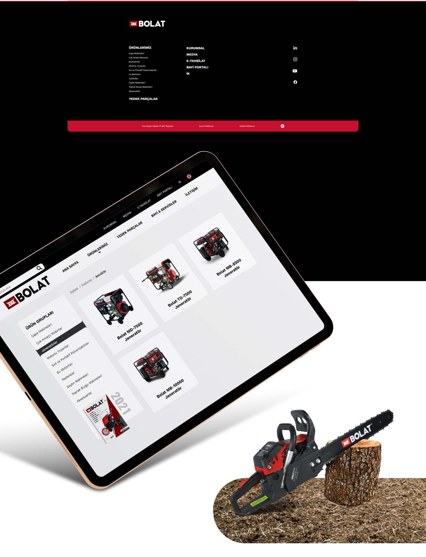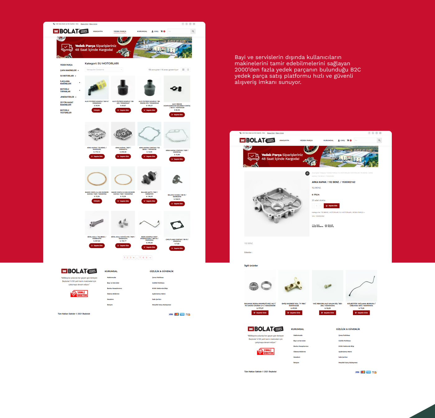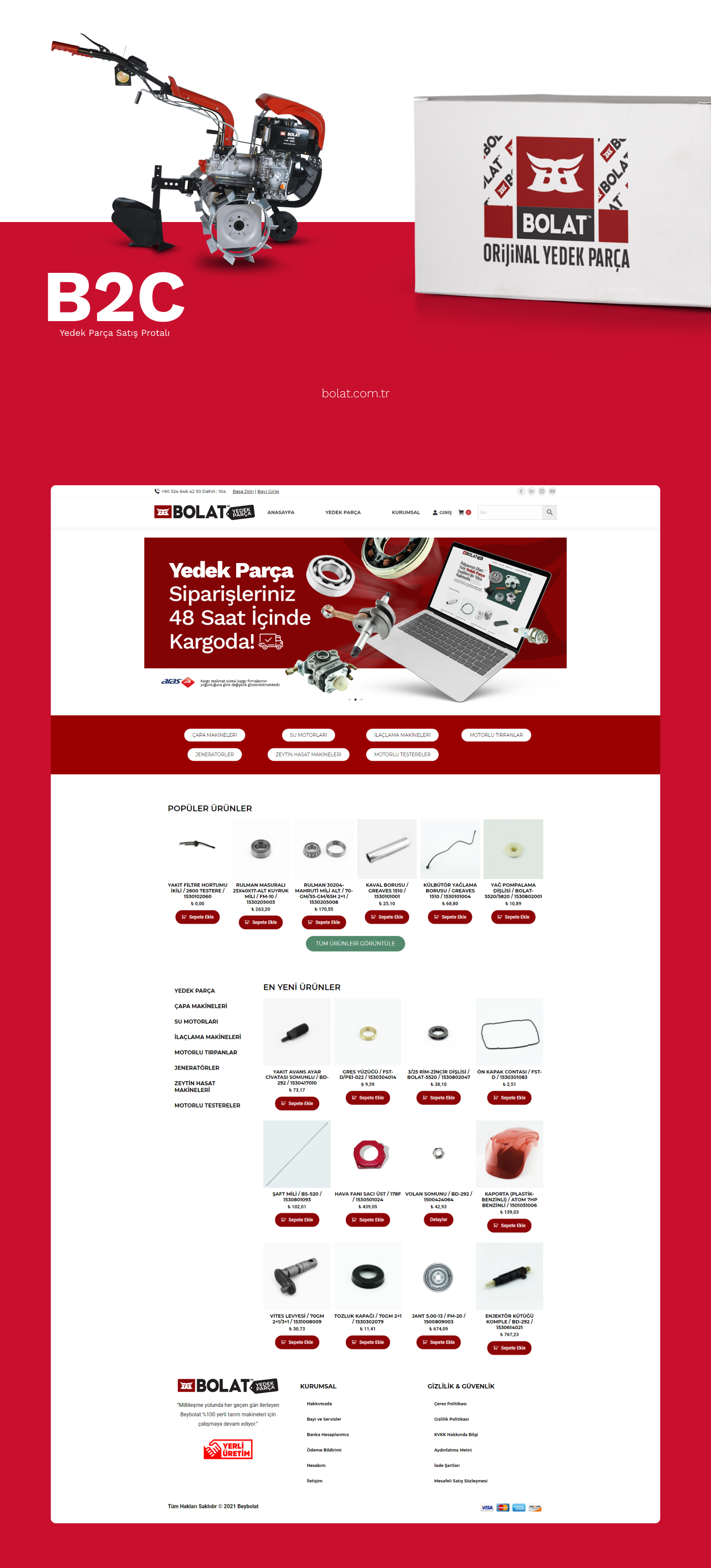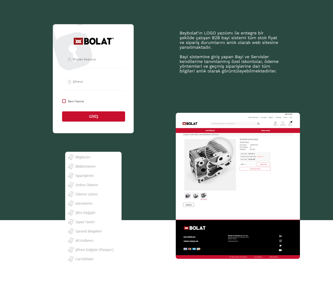 Mersin'in önde gelen tarım makinesi üreticilerinden Beybolat firması için tasarımını ve kodlamasını yaptığımız kurumsal web sitesi, bayileri için oluşturduğumuz B2B sistemi ve yedek parça satışı için hazırladığımız B2C alışveriş sitesi.