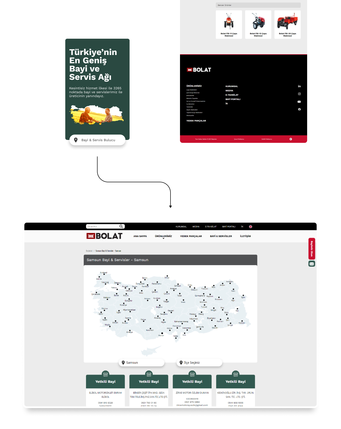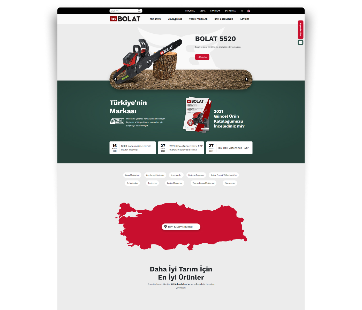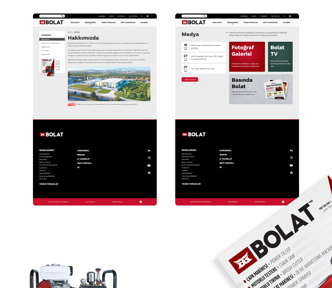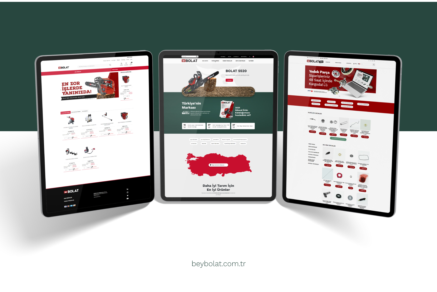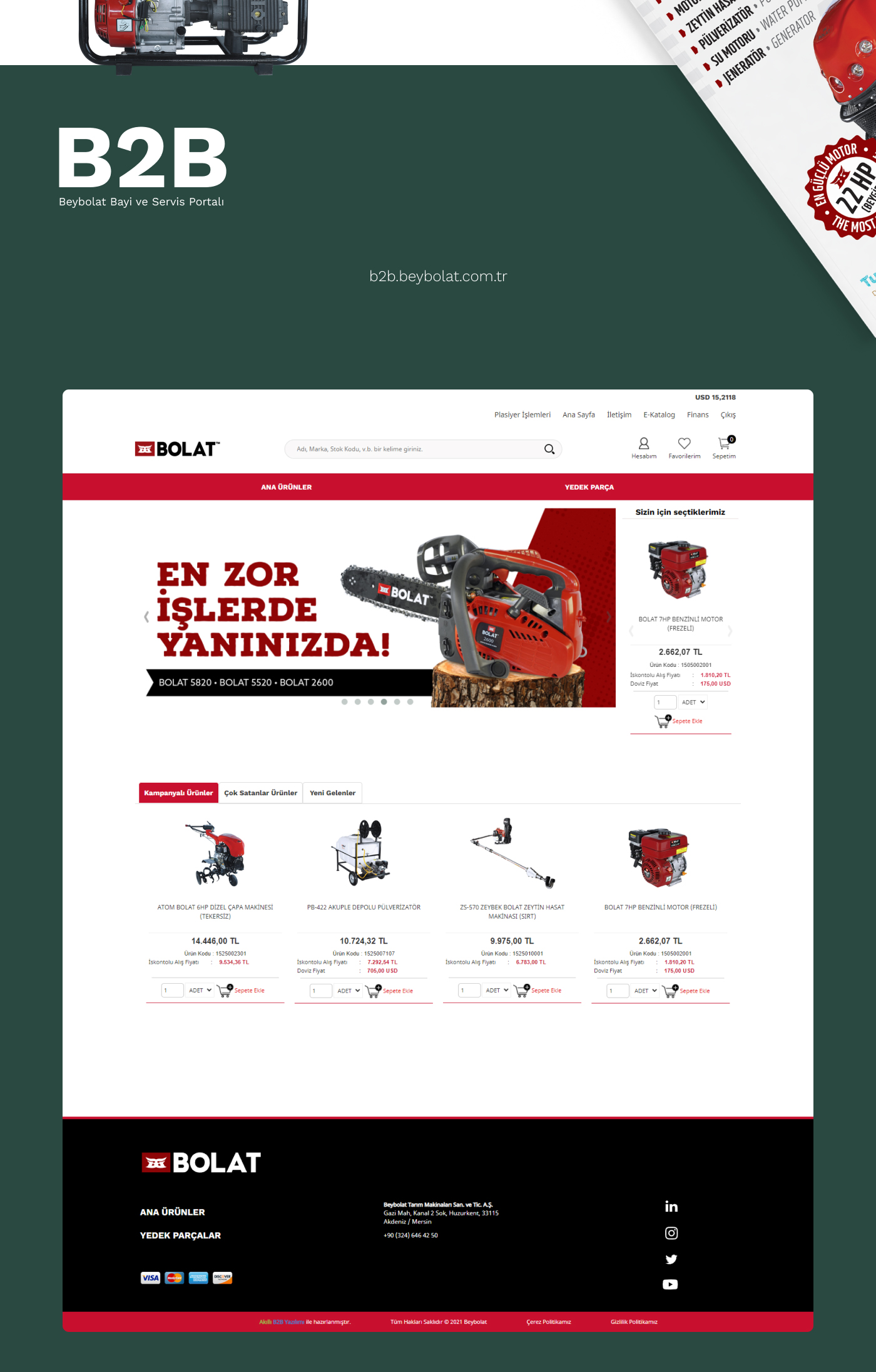 Mersin'in önde gelen tarım makinesi üreticilerinden Beybolat firması için tasarımını ve kodlamasını yaptığımız kurumsal web sitesi, bayileri için oluşturduğumuz B2B sistemi ve yedek parça satışı için hazırladığımız B2C alışveriş sitesi.